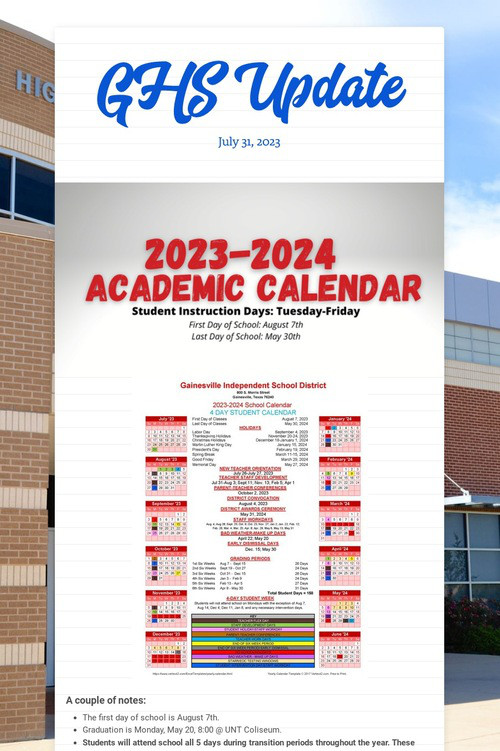 Gainesville Isd 2024 Calendar 2023 2024 Academic Calendar / 2023 2024 Academic Calendar: Gainesville ISD needs substitute teachers. All subs, both new and returning, are required to attend orientation prior to being approved for employment for the 2023-24 school year. The next orientation . A new Publix Super Markets-anchored shopping center will be coming near the downtown Gainesville area Parkway and New Holland Way and is slated to be completed by mid-2024. Branch Properties .